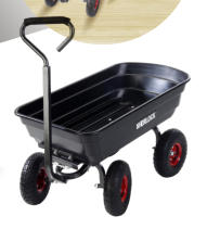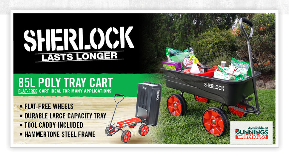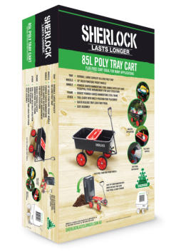 SHERLOCK 67L Poly Tray CartProduct Code: BBGC75Key Features:· Tray- Durable 67 litre poly tray· Wheels - Standard 10” x 3.5” pneumatic wheels on steel rims· Handle - Powder coated hammertone steel handle with soft grip, push/pull pivot arrangement for easy steer/turn· Frame - Robust powder coated hammertone steel frame with Easy-Tip configuration· Other- Easy assemblyThe ideal cart for all your DIY and garden work.