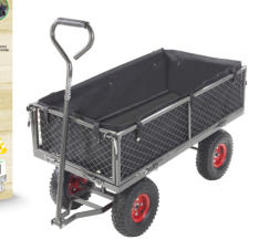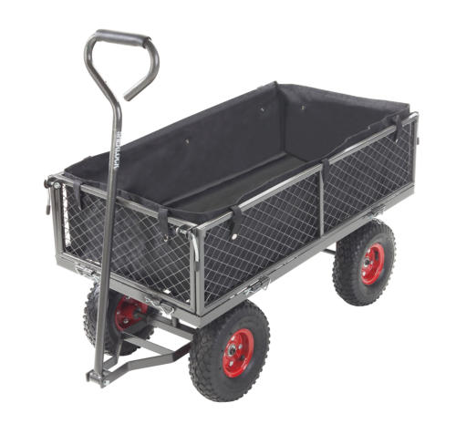SHERLOCK 200kg Steel Mesh CartProduct Code: BBGC200S2Key Features:· Tray- Durable 200kg load hammertone steel mesh tray with liner (105 Litres)· Wheels - Standard 10” x 3.5” pneumatic wheels on steel rims· Handles- Powder coated hammertone steel handle with soft grip, push/pull pivot arrangement for easy steer/turn· Frame-Robust powder coated hammertone steel frameThe ideal cart for many applications.