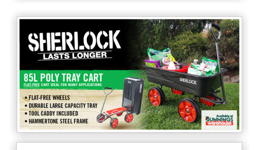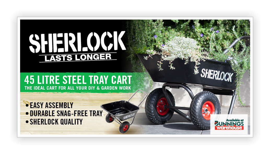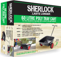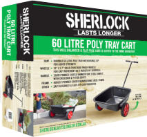 SHERLOCK Home Use 60L CartProduct Code: BBGC60PK2Key Features:· Tray- 60L U.V. Treated Premium Polypropylene Tray with a Double Lip for added strength· Wheels- Twin Solid Wheels for easy movement on a variety of surfaces· Handles- 25mm powder coated Steel Handle with crossbar and fitted grips· Frame- Robust powder coated hammertone steel frame· Other - Easy assembly & easy-tip configurationDesigned for the home gardener, ideal for carting potting mix, mulch or waste - well balanced and light.